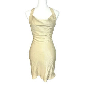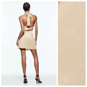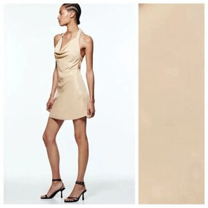 Zara Iridescent Satin Effect Mini Dress Draped Neck Open Back XS Gold Beige Y2K