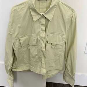 Light green button down top/jacket. I’m a size medium and this is a perfect oversized look for me, the length hit the top of my jeans. Perfect for layering.