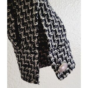 This stylish Zara shacket is perfect for any casual occasion. With a black tweed textured woven plaid design and frayed accents, this mid-length jacket features long sleeves and a button closure. The oversized fit and pockets make it both comfortable and practical.