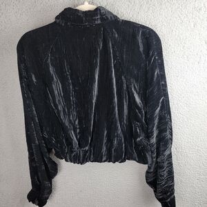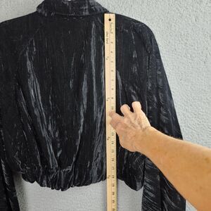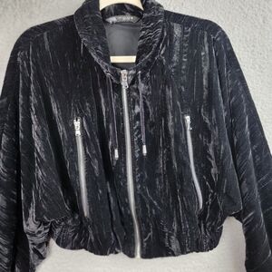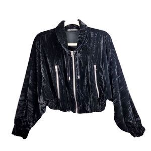 Zara Jacket Womens M Black Crushed Velvet Cropped Silver Zipper Pockets Dolman