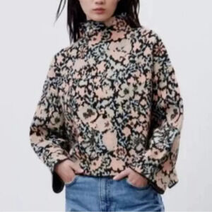 Zara Jacquard High Neck Wool Blend Floral Cozy Knit Sweater Pink Women's Size S