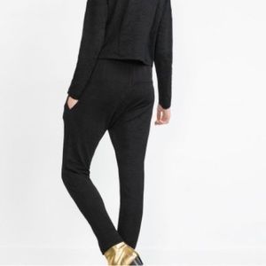 Zara jacquard jogging trouser. Black. Large. Shiny black trouser made of elastin and polyester. Tie at waist. Side pockets. Ankle length. Slim fit at ankle. Very comfortable. Perfect for a casual day but also has enough shine to spice up any work outfit. No tags but only worn once.