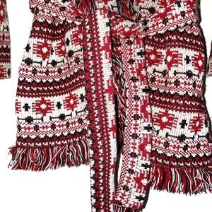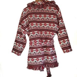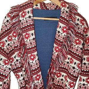 Zara Jacquard Tribal Navajo Aztec Southwest Knit Fringe Coat Red Black Med.