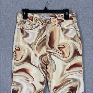 Zara Jeans 4 Cream Brown Button Fly Swirls Marbled Psychedelic Abstract Cotton