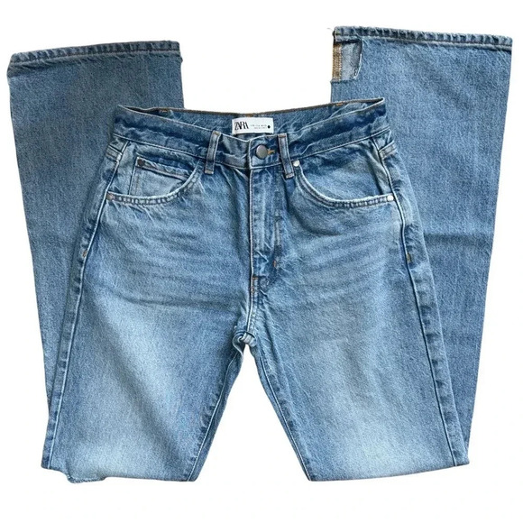 Classic Zara jeans in light blue denim. High-rise waist with front button and zip. Five-pocket styling and subtle wash. Versatile casual staple.