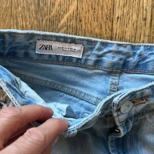 Very flattering not distressed full length straight leg jeans from Zara. Not stretchy. Perfect light blue color