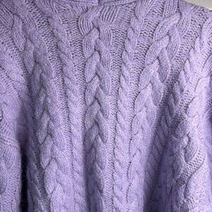 This lavender cropped thick cozy cardigan features a cable knit design and intricate rhinestone buttons that add a touch of elegance. Its soft texture and oversized fit make it a stylish and versatile addition to your wardrobe, whether layered or worn alone.