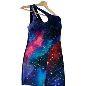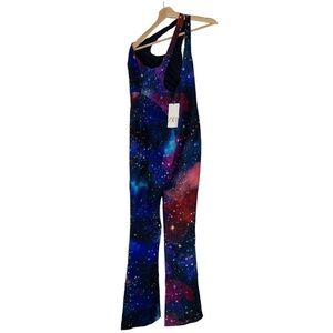 NEW with tags Zara Galaxy One Shoulder Jumpsuit Size M/L. Features: Cosmic Galactica one piece jumpsuit. Ones shoulder with cut out detailing, Long slimming silhouette leading in to a flare leg.