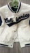 Stylish cream and navy jacket. Features bold lettering and number detail. Perfect for cool weather.