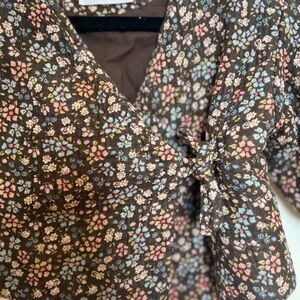 This Zara Kids floral wrap jacket is perfect for your little one's wardrobe. Featuring a charming floral pattern on a brown background, it's both stylish and comfortable.