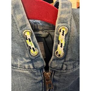 Hooded denim jacket with long sleeves and elastic cuffs. Front zip closure. Front pockets with piping detail and the DNMWR patch on one of the pockets. Elastic hem.