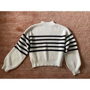 Zara kids sweater in white with black horizontal stripes, size 11–12 years (152 cm). Made in Bangladesh from 44% viscose, 33% polyamide, and 22% polyester, this knit is soft, cozy, and holds its shape well. Features a mock neck, ribbed hem, and long balloon-style sleeves with stripe detail for a modern nautical look. Approx. measurements: pit-to-pit 18”, length 18”. Pre-owned and in excellent condition with no visible flaws. Perfect for casual wear, layering, or school outfits.