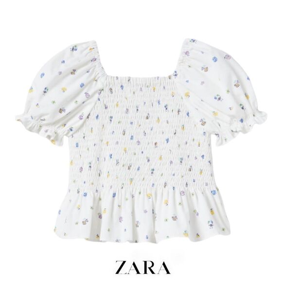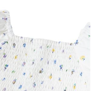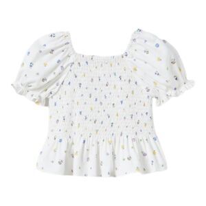 Adorable white top with colorful floral design. Features puff sleeves and smocked detail. Ideal for playful days.