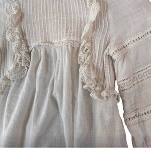 This Zara Kids peasant-style blouse channels sweet boho charm with its soft white cotton fabric, crochet-trim accents, and billowy gathered shape. Features a v-neckline, long sleeves with pintuck lace insets, and buttoned cuffs. Size 7 (122 cm), made in India.