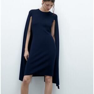 Zara Knit Cape Dress S Navy Blue Party Trendy Sleeveless Classic Cocktail NEW