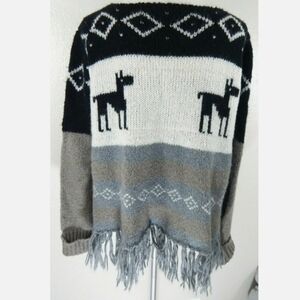 Item: Women's Pullover Fringe Trim Cowichan Tribal Style Dog Pattern Sweater Oversized Boxy Fit