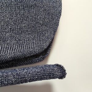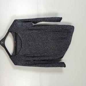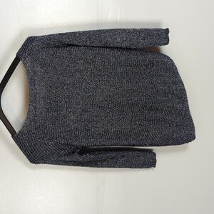 Navy blue and metallic silver material. Wide bateau neckline (can almost be worn off shoulder). Long sleeves. Asymmetrical hemline. Slightly sheer material. Some pilling, but no stains, holes, or fraying. Laid flat pit-to-pit: 19in. Shoulder to hem (left): 29in. Shoulder to hem (right): 21in.