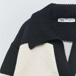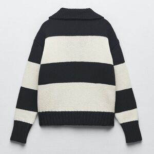 Collared V-neck knit sweater with long sleeves and ribbed trims.