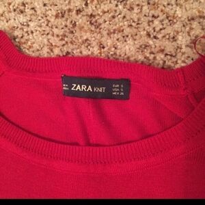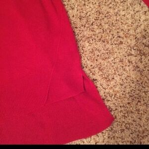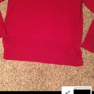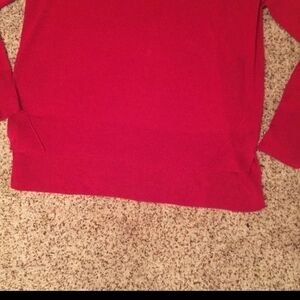 NWOT darker red pullover sweater with hi-low hem and detailed side slits. Very light material. Truer color is a little darker red than the pics are showing. There is a very small fabric color variation flaw on front, see last pic. It is quite faint and small.