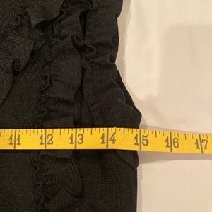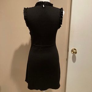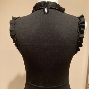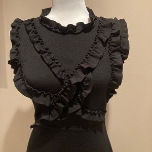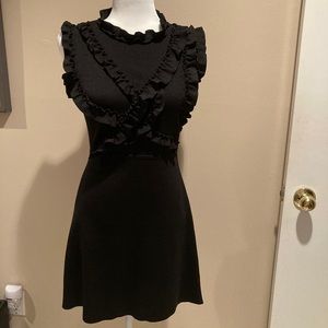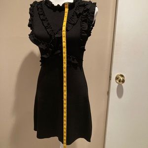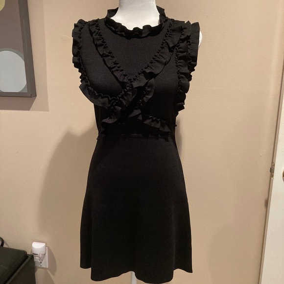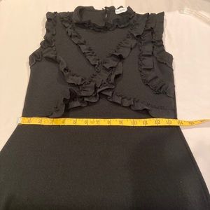 Flattering and fitted Zara knit dress in black. The top front half has several ruffled bands across the bust area and around the sleeves. The dress has a knit band that accentuates the waist and a button at the back, neck area. The knit fabric is heavy, providing support, shape and coverage. Like-new condition, no snags, stains or damage. It is a size small.