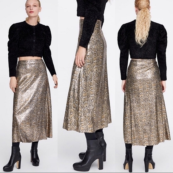 Zara Knit Sequin Snake Print A-line Midi Skirt Size M