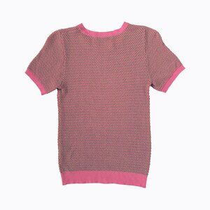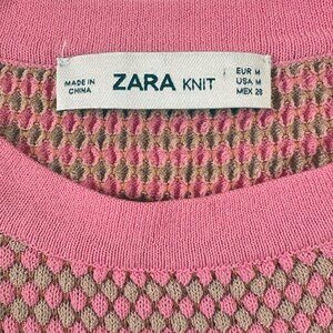 Add a pop of color to your wardrobe with this vibrant Zara knit sweater, a perfect example of trendy and accessible style. This pullover features a striking bubblegum pink with a contrasting tan knit pattern, finished with a classic pink trim at the round neckline and short sleeves. Made from a lightweight and breathable blend of viscose and nylon, the fabric is designed to be stretchy for a comfortable, close-to-the-body fit.