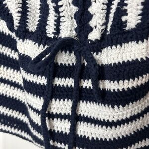 Stylish Zara Knit crochet tank top in black and white stripes. Features a V-neckline, tie front with tassel detail, and a lightweight hand-knit style thats perfect for layering or wearing solo in warm weather. Bohemian vibe meets modern Zara style.