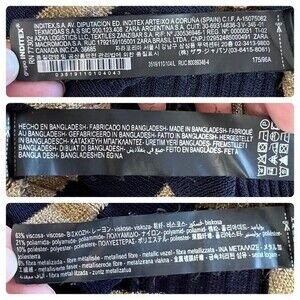 Metallic Gold and Navy Striped Printed Ribbed Cropped Knit Top by Zara. Stripe crew neck. Long sleeve with thin stripes at cuffs. Very stretchy and semi sheer behind the navy blue. Slightly cropped in length, hits at the waist. Ribbed texture with wider ribs pattern along the bottom. Good used condition. One minor repair on the back as pictured.