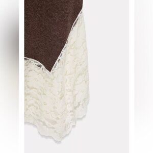 Long dress with perkins collar and sleeveless design. Flared hem with contrasting lace. Back closure with a concealed in-seam hidden zipper.