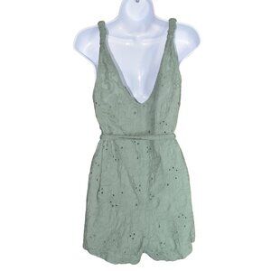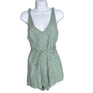 Zara Large Eyelet Lace Romper Women’s L Sage Green Cotton Blend Tie Waist Boho