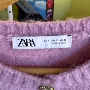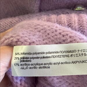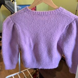 Soft lavender cardigan with elegant buttons. Fuzzy, fancy puffed shoulders, size Small but fits very small. About 17 inches in length so maybe more of a crop length. Excellent shape!