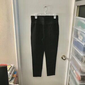 Never worn before black leggings with a high ribbed elastic waist. Has a seam on the front legs. Bottom is straight-legged. Material is listed as 77% polyester and 23% elastine. Measurements can be found below: