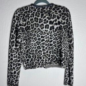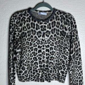 Fun leopard print cardigan with beaded buttons and beaded neckline