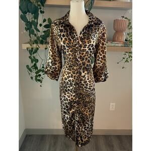 Zara Leopard Print Satin Button Down Midi 3/4 Sleeve Dress XL Fall Chic Office