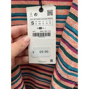 Add a pop of color to your wardrobe with this brand new Zara Leslie over shirt. Features bold teal, pink, orange, and cream stripes for a fresh, modern look. Designed with an open front, collar, long sleeves, and two front pockets, this piece is perfect worn as a light jacket or layered over your favorite tops.