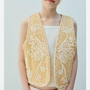 Zara Light Beige Embroidered Girls Cotton Blend Vest(Size 13-14)