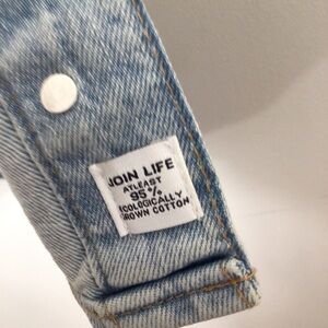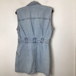 Sleeveless denim dress. Button-down front. Waist belt detail. Casual and stylish.