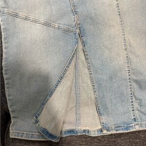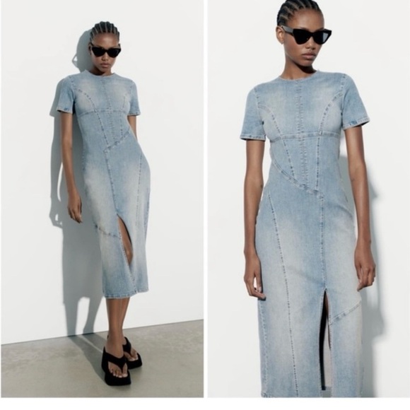 Chic light blue denim dress. Features unique seam design. Midi length with front slit. Ideal for casual outings.