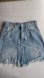 Trendy light blue jean skirt with a frayed hem. Features a distressed design for a modern look.