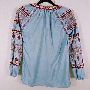 Light blue button down top. Red and white embroidery. Bohemian, floral print. TRF collection.