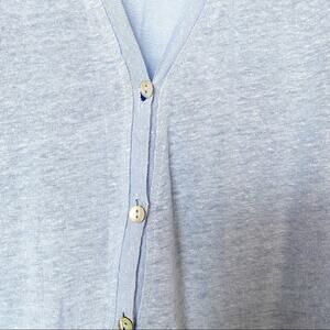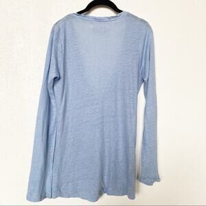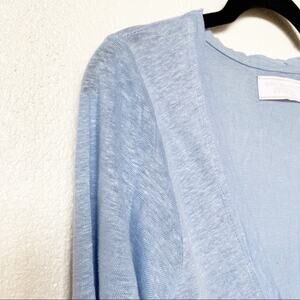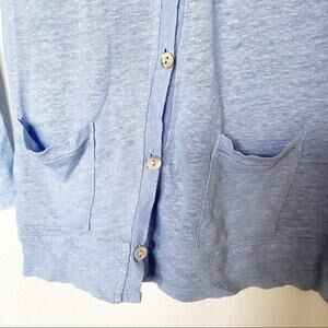 Long sleeve button front cardigan from Zara. Light blue, size medium. Top two button holes are stretched out and don't stay buttoned very well, easy fix! Light staining on the front and under the left arm, shown in the photos. Material feels like a linen blend, but fabric tag is missing so I cannot confirm.
