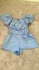 Stylish light blue jumpsuit with ruffled neckline. Features a matching belt for a chic look.