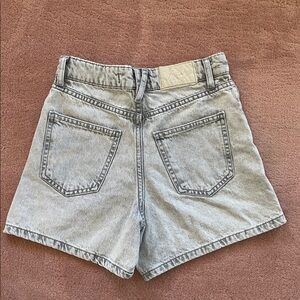 Trendy light gray denim shorts. Features branded button detail. Perfect for casual outings.