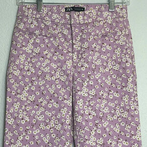 Zara Light Purple White Floral Print Flare Cropped Pants Womens Size Medium