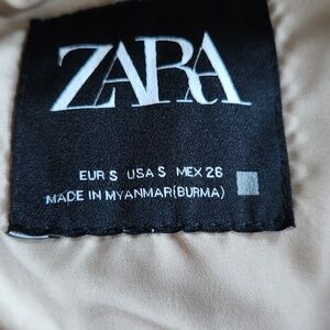 Chic Zara puffer with a warm hood. Features front pockets and drawstring details. Ideal for chilly days.
