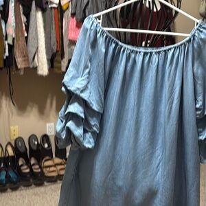 Elevate your style with this elegant blue on or off-shoulder lightweight denim mini shift dress from Zara. Featuring charming ruffle sleeves, it's perfect for any occasion.
