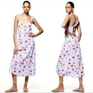 Zara Linen Blend Ruffled Straps Floral Midi Dress L NWT