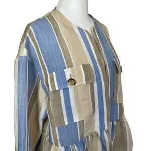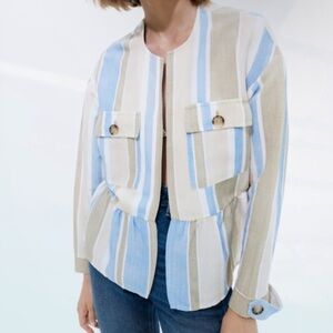 Zara Linen Blend Striped Open Front Blazer Jacket Peplum Hem Boho Spring Sz S