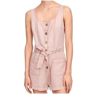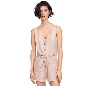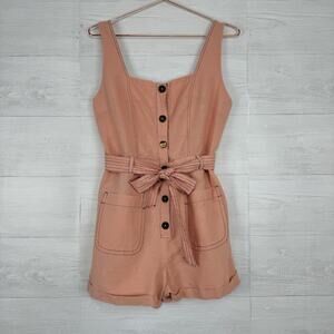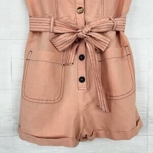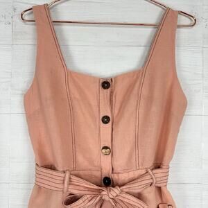Zara Linen Blend Tie Waist Button Down Romper Size M Peach Square Neck Coquette