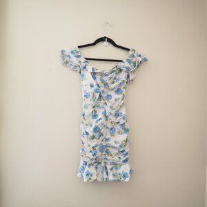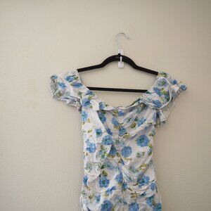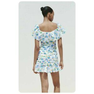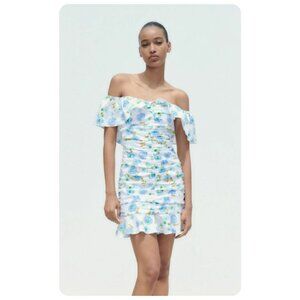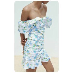 Zara Linen Blend White Blue Floral Off The Shoulder Mini Dress sz S